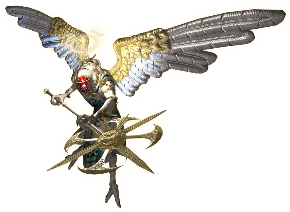 [Well... maybe "fight" isn't quite the term for it. That implies a certain even capability between parties. At one point the stiletto-heeled woman punts one of the heavy creatures into the air with astonishing strength before unloading a cache of bullets from a very big gun into it in midair. Another takes a swipe with those holy polearm things; she backbends at the last second, firing a pistol... from her heel? (Yes. Her heels have guns.) into her attacker, blasting it back with a flurry of feathers. A third tries to swipe at her in melee, and she blocks it and forcibly rips the offending arm off of the creature with the kind of sound one wouldn't expect living flesh to make when torn apart.]